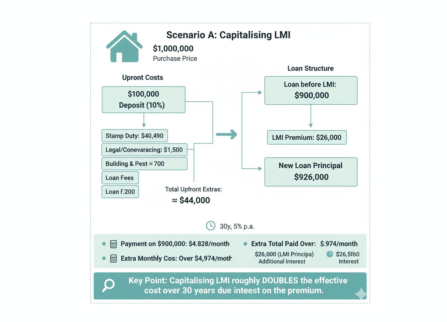 Key point: capitalising LMI spreads the premium, but you pay interest on that premium for the life of the loan, roughly doubling the effective cost over 30 years in this illustration.
