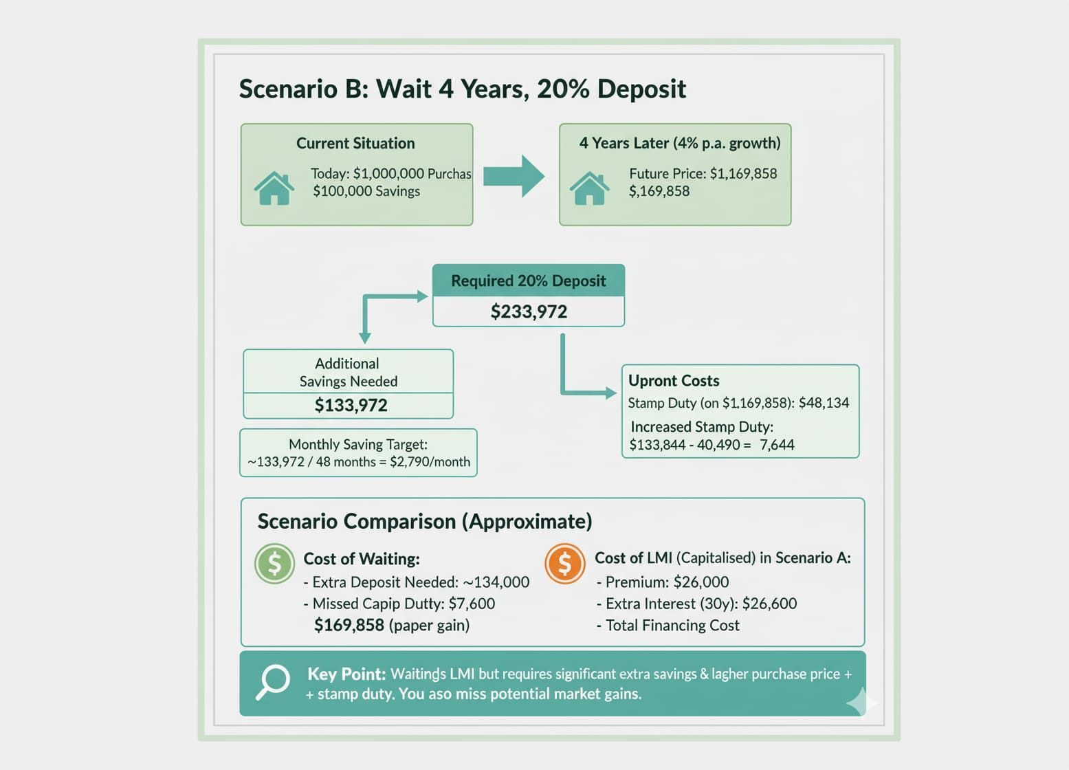 - If you wait 4 years to avoid LMI and reach 20% deposit, the purchase price likely rises ~17% (in this example), so the cash needed increases significantly (you need to save ~A$134k more plus you face higher stamp duty). You also miss any capital gains that accrue in the meantime. And miss out on being able to buy in the location you want as prices would have gone up.
